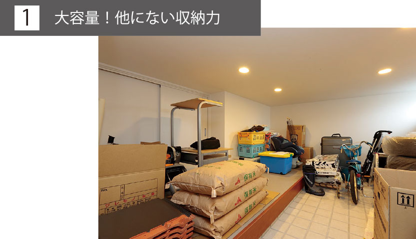 押し入れやクローゼットなどに比べ圧倒的大容量な収納力を実現。冬物の厚手の服や、夏のレジャーグッズ、BBQ道具などの季節物から、ひな人形などの思い出の品など普段使わない物をまとめて収納することができる便利なスペースです。